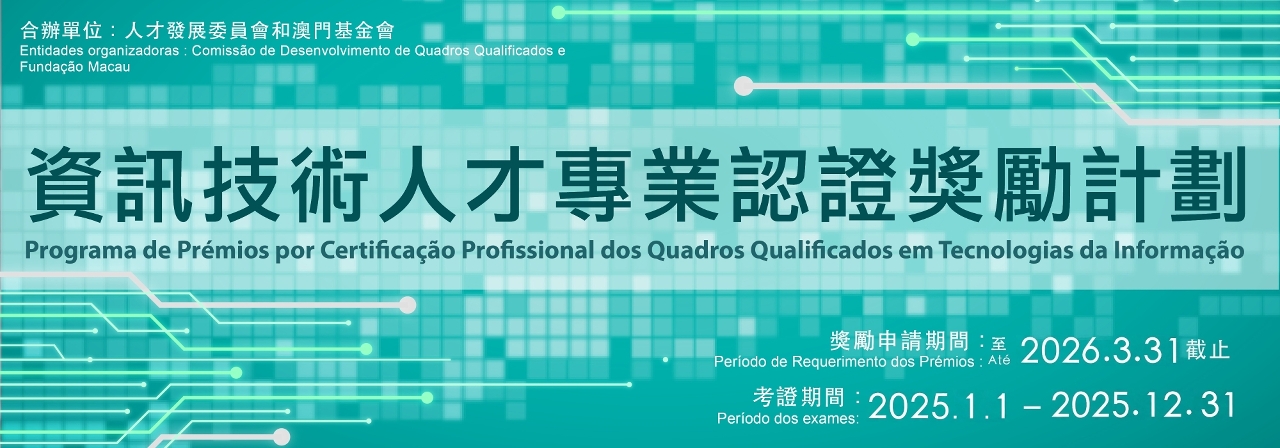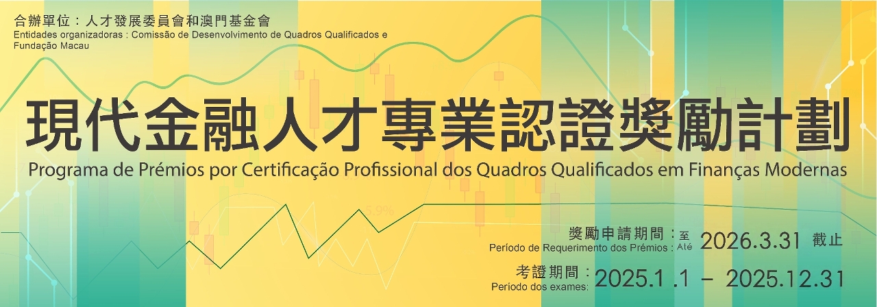 O período de candidaturas ao “Programa de Estímulo à Formação e aos Exames de Credenciação dos Quadros Qualificados” (adiante designado por Programa), organizado em conjunto pela Comissão de Desenvolvimento de Quadros Qualificados (CDQQ) e pela Fundação Macau, decorre entre 1 de Dezembro e 31 de Março de 2026. São candidatos elegíveis os residentes de Macau que obtenham a certificação entre 1 de Janeiro e 31 de Dezembro de 2025. Os catálogos de prémios incluem: avaliação da competência em línguas estrangeiras, exames de credenciação para orientação sectorial, “Certificação Profissional dos Quadros Qualificados em Finanças Modernas” e “Certificação Profissional dos Quadros Qualificados em Tecnologias da Informação”. Aos candidatos aprovados serão atribuídos os correspondentes prémios.