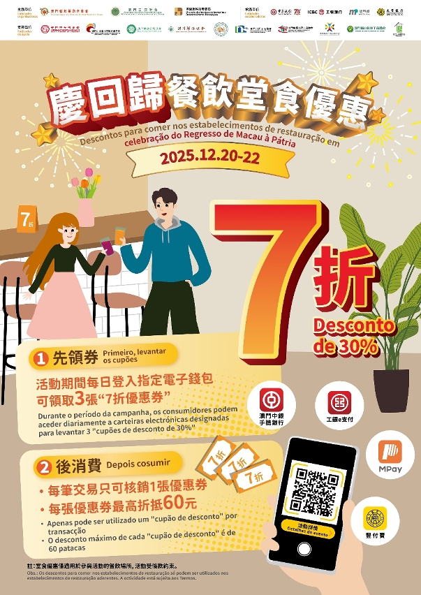 Para celebrar o 26.º aniversário do Regresso de Macau à Pátria e revitalizar o consumo nos bairros comunitários, o Governo, juntamente com a União das Associações dos Proprietários de Estabelecimentos de Restauração e Bebidas de Macau e a Associação Industrial e Comercial de Macau, irá lançar, amanhã (dia 20), a actividade “Descontos para comer nos estabelecimentos de restauração em celebração do Regresso de Macau à Pátria”, durante três dias consecutivos. Após o levantamento dos cupões de desconto, os residentes que paguem através dos meios de pagamentos móveis designados, podem usufruir de um desconto de 30% em mais de 500 restaurantes aderentes de Macau.
