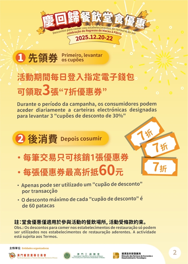 A actividade decorrerá entre 20 e 22 de Dezembro. Os residentes podem levantar os cupões de 30% de desconto para consumo, que podem ser utilizados para comer nos restaurantes aderentes, através das quatro aplicações de telemóvel dos meios de pagamentos parceiros. Participam na actividade mais de 500 lojas, abrangendo diferentes bairros comunitários de Macau, unindo esforços para dinamizar o consumo durante o feriado festivo. Para prestar um apoio preciso às pequenas e médias empresas, esta actividade não inclui os estabelecimentos de restauração localizados nas instalações das empresas integradas de turismo e lazer.