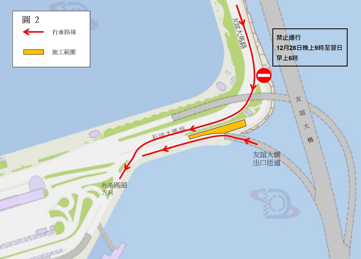 Para articular com a necessidade da obra de execução de via de acesso (A3) entre Zona A dos Novos Aterros Urbanos e Península de Macau, serão efectuados os trabalhos de pavimentação com asfalto num troço situado junto da estação de radar da Avenida da Amizade, por esta razão, das10:00da noite do dia 27 de Dezembro de 2025 até às06:00da manhã do dia seguinte, a rampa de acesso da Ponte da Amizade em direcção à zona central de Macau e a curva situada na estação de radar, em direcção de Avenida da Amizade para o Terminal Marítimo do Porto Exterior, terão de ser temporariamente encerradas, devendo os condutores que circulam de Ponte da Amizade para a zona central de Macau contornarem a via ou utilizarem outras pontes marítimas. Além disso, das09:00da noite do dia 28 de Dezembro de 2025 até às06:00da manhã do dia seguinte, a via de trânsito situada na curva da estação de radar da Avenida da Amizade em direcção ao Terminal Marítimo do Porto Exterior também será encerrada temporariamente, pelo que se solicita aos condutores que prestem atenção.