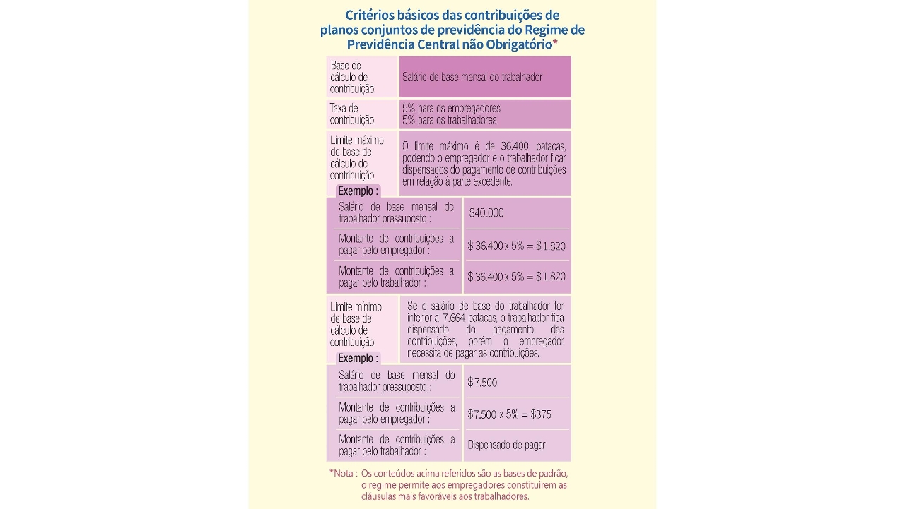 Nos termos da Lei n.º 7/2017 (Regime de previdência central não obrigatório), a base de cálculo de contribuição para os planos conjuntos de previdência tem por base o salário de base mensal do trabalhador, sendo o valor das contribuições correspondente a 5% da base de cálculo de contribuição. Se o salário de base do trabalhador efectivo do mês em causa, deduzido das contribuições, for inferior ao valor do salário mínimo acima referido, o trabalhador fica dispensado das contribuições e o empregador tem de pagar as contribuições; se o salário de base do trabalhador efectivo do mês em causa exceder cinco vezes o valor do salário mínimo, o empregador e o trabalhador não necessitam de efectuar contribuições em relação à parte excedente. Após o aumento do valor do salário mínimo, o limite mínimo da base de cálculo das contribuições para os planos conjuntos de previdência será aumentado para 7.664 patacas, e o limite máximo para 36.400 patacas.