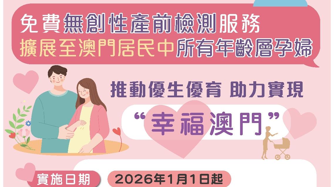 Os Serviços de Saúde alargam os serviços de NIPT às grávidas de todos os grupos etários (residentes de Macau), permitindo que mais famílias, em particular as grávidas de maior risco, tenham acesso atempado a informações cruciais sobre a saúde pré-natal, de modo a apoiar num planeamento familiar e de cuidados de saúde mais adequado, contribuindo assim para a redução dos encargos económico e emocional das famílias e, para a concretização da acção governativa de “Macau Feliz”. Para mais informações, é favor ligar para a linha aberta 8390 8240 durante o horário de expediente.