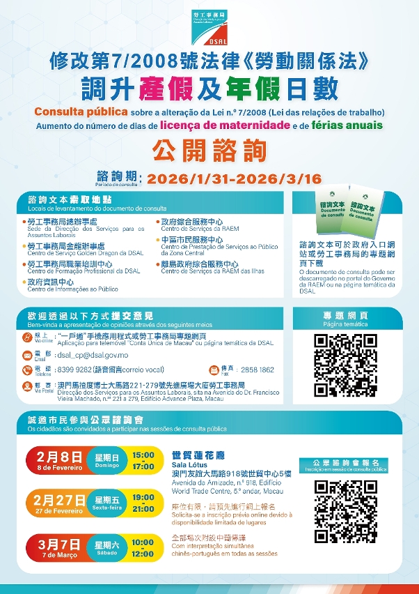 O Governo da Região Administrativa Especial de Macau (RAEM) realiza uma consulta pública a decorrer durante 45 dias, a partir de hoje (dia 31) e até 16 de Março, sobre a alteração do número de dias de licença de maternidade e de férias anuais previstos na Lei n.º 7/2008 (Lei das relações de trabalho). No documento de consulta, propõe-se que a licença de maternidade seja aumentada para 90 dias, e que as férias anuais sejam aumentadas por antiguidade, acrescendo 1 dia útil ao número de dias de férias anuais por cada 2 anos completos de serviço, até um máximo de 12 dias úteis, no sentido de optimizar continuamente a garantia dos direitos e interesses laborais, para que os trabalhadores possam encontrar um melhor equilíbrio entre o trabalho e a vida familiar. O Governo da RAEM espera que, através desta forma de consulta pública, contribua para juntar mais sabedoria, auscultando as opiniões e sugestões dos diversos sectores da sociedade sobre o conteúdo da alteração da lei.