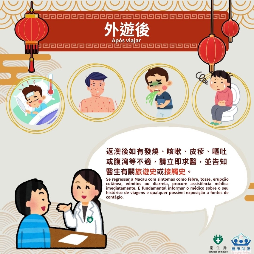 Após regressar de uma viagem, os residentes devem prestar estreita atenção ao seu estado de saúde. Se apresentarem sintomas de indisposição tais como febre, tosse, erupção cutânea, vómitos ou diarreia, devem procurar assistência médica imediatamente e informar o médico sobre a sua história de viagens e de contactos, a fim de serem submetidos a um diagnóstico e tratamento atempados e adequados.