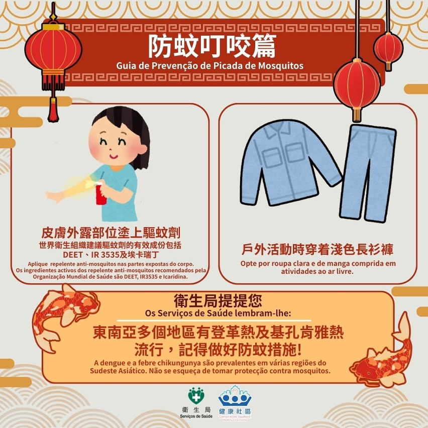 Com a aproximação do Ano Novo Lunar, muitos residentes planeiam viajar para celebrar esta esta quadra festiva ou participar nas diversas actividades de convívio. Os Serviços de Saúde lembram a população de que, ao festejar as festividades, deve tomar as devidas medidas de protecção da saúde, em particular, proteger-se contra os mosquitos e as doenças infecciosas do tracto respiratório ou gastrointestinal, salvaguardando efectivamente a saúde pessoal e familiar, para que todos possam passar juntos a Festa da Primavera com paz e saúde.