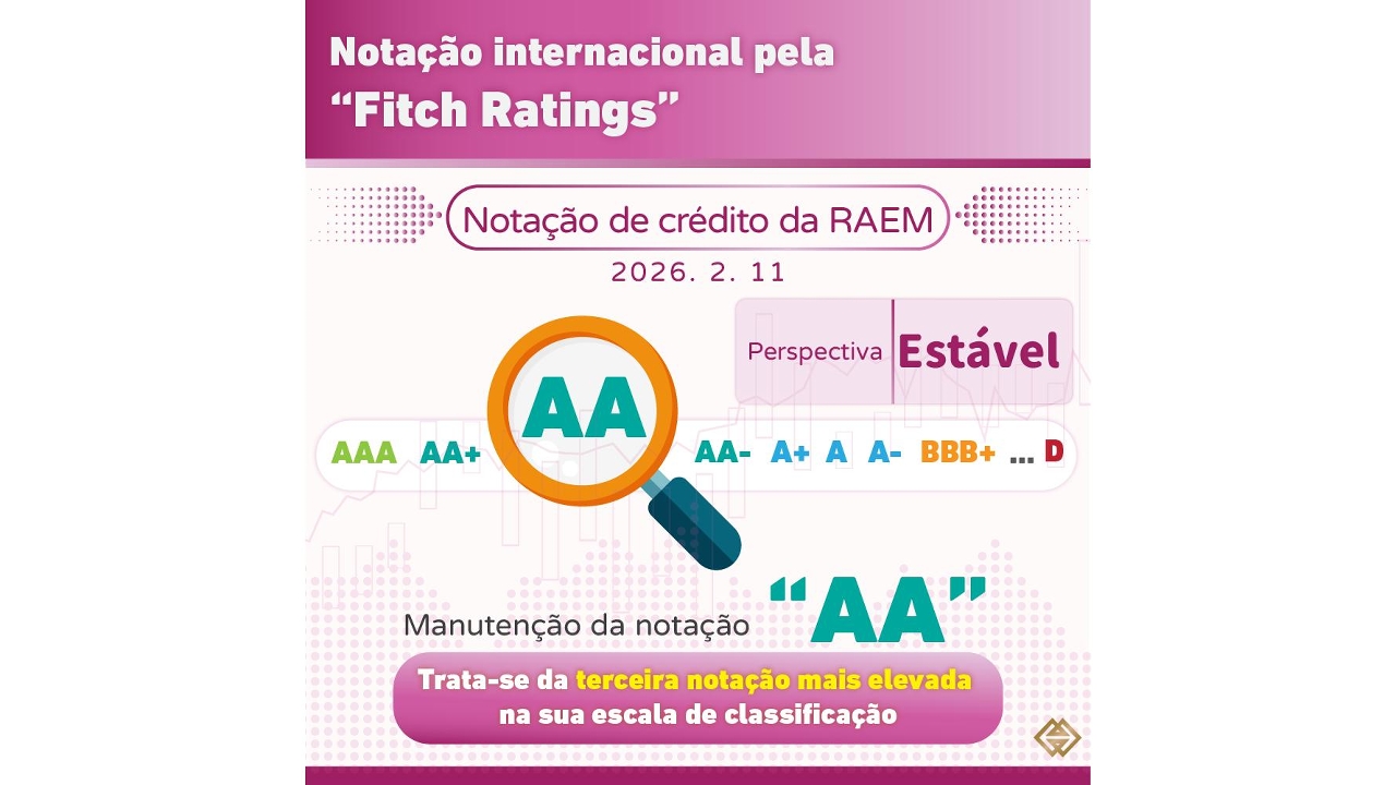 A agência internacional de notação “Fitch Ratings” (adiante designada por “Fitch Ratings”) publicou hoje (dia 11) uma nota de imprensa, na qual informa que decidiu manter o grau de notação de crédito de longo prazo “AA” (notação de emissor de dívidas externas e locais) atribuída à RAEM, com referência a perspectivas de “estável”.