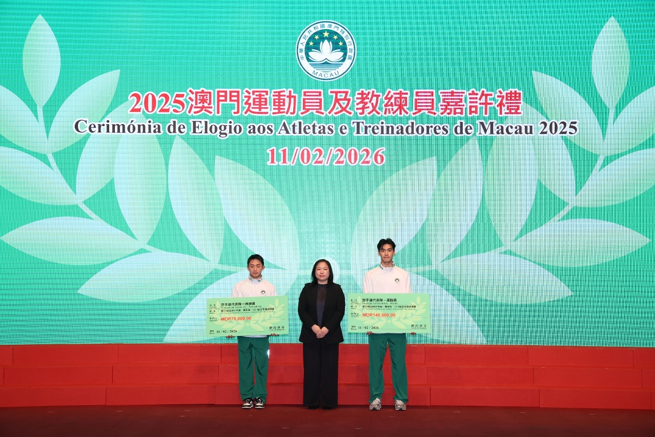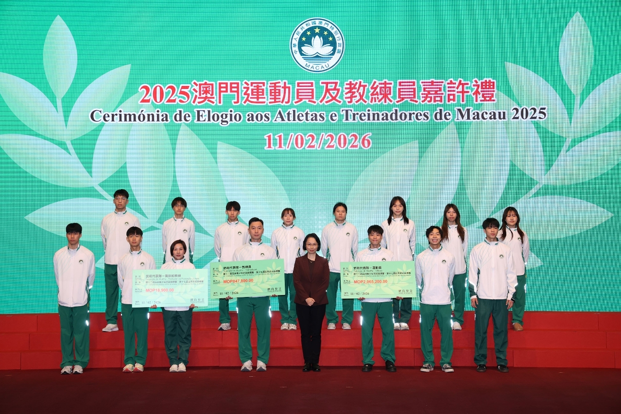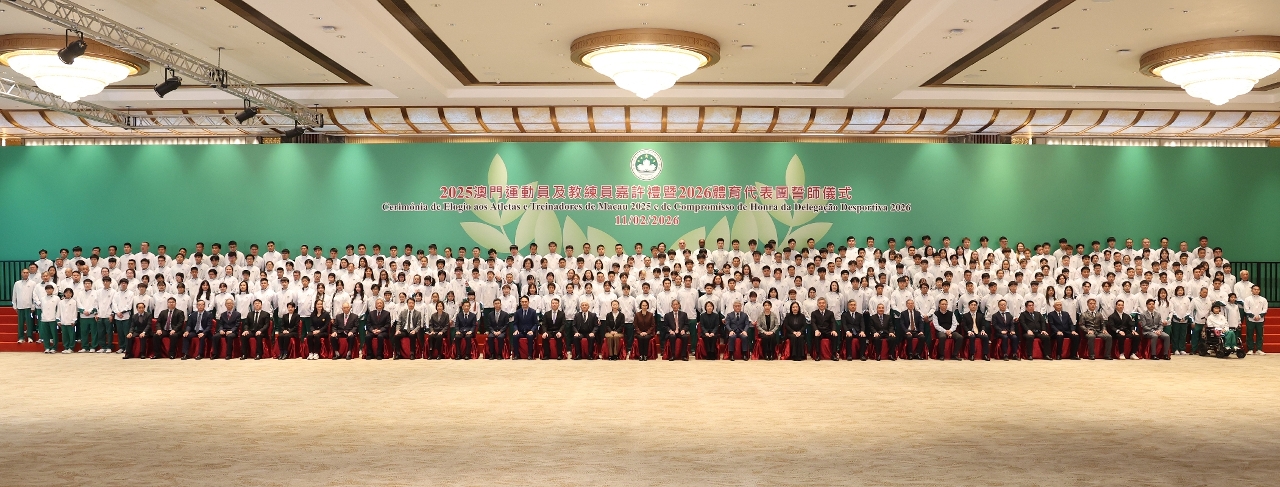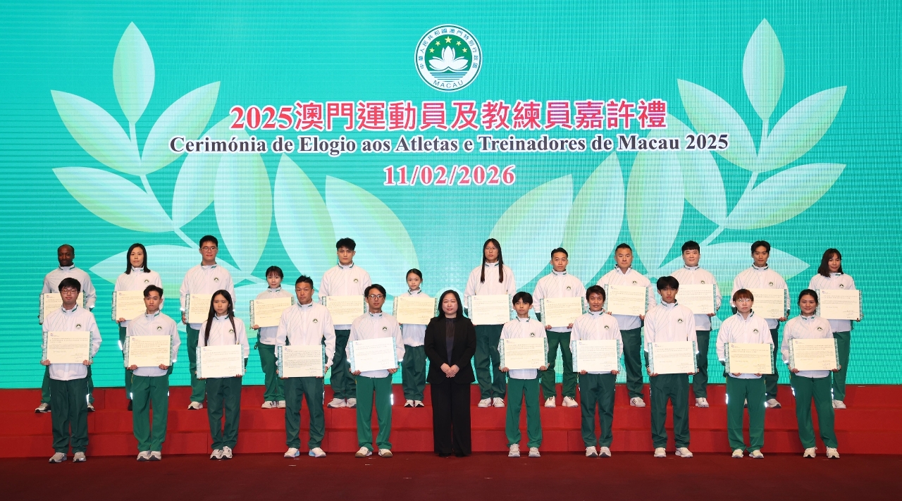Para elogiar os atletas, treinadores e pessoal de apoio técnico de Macau que alcançaram resultados notáveis em competições desportivas de 2025, e para incentivar a Delegação Desportiva de Macau a destacar-se em grandes eventos desportivos do corrente ano, realizou-se ontem (dia 11), às 19H30, a Cerimónia de Elogio aos Atletas e Treinadores de Macau 2025 e de Compromisso de Honra da Delegação Desportiva 2026, com a presença da Secretária para os Assuntos Sociais e Cultura, O Lam, e de outros convidados para encorajar e felicitar os atletas.