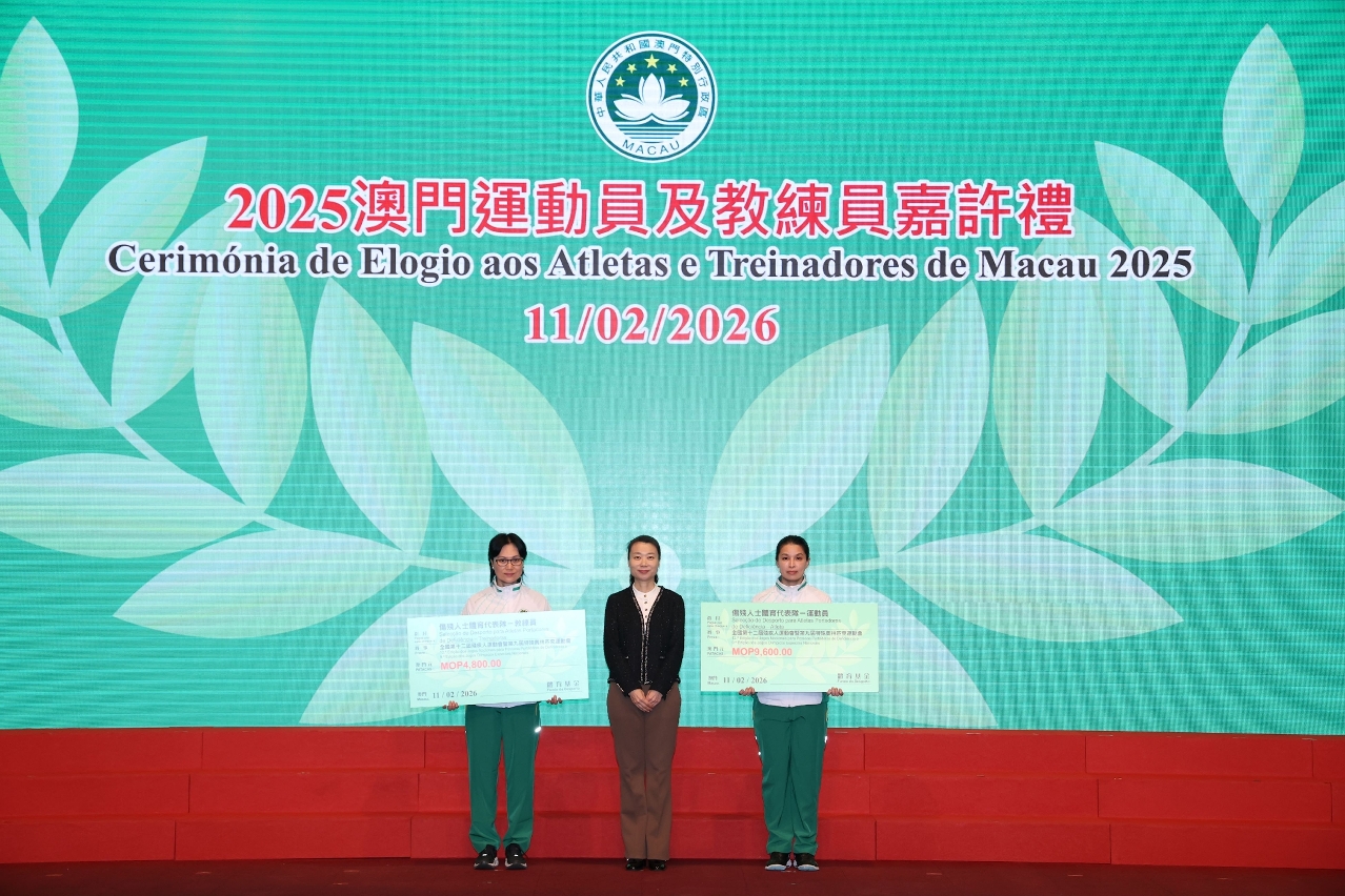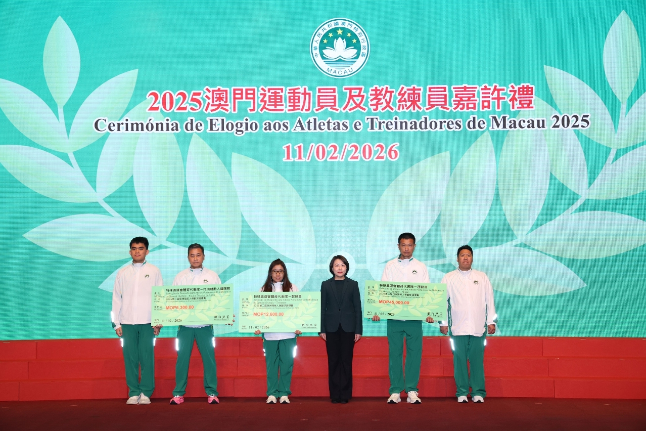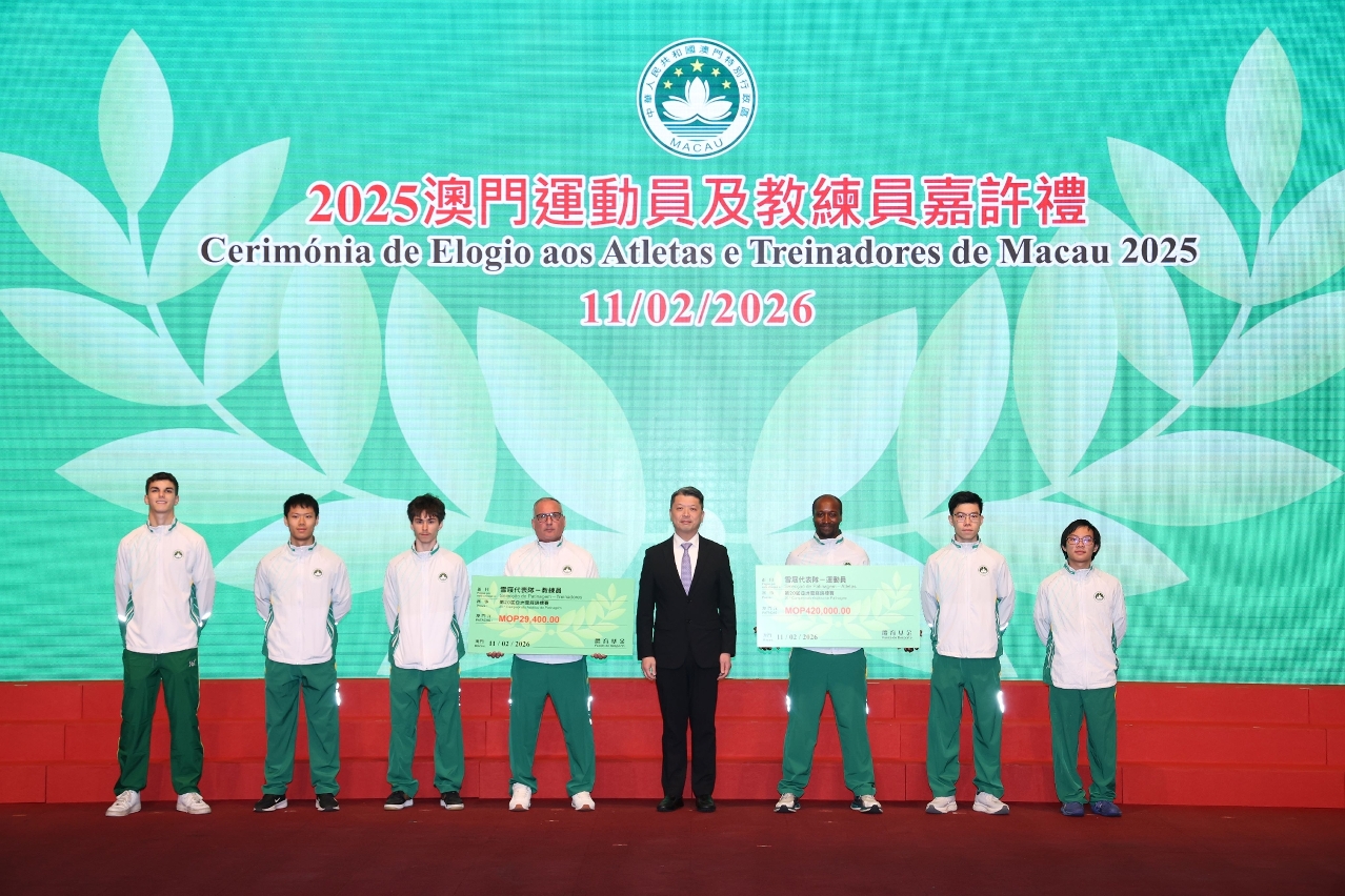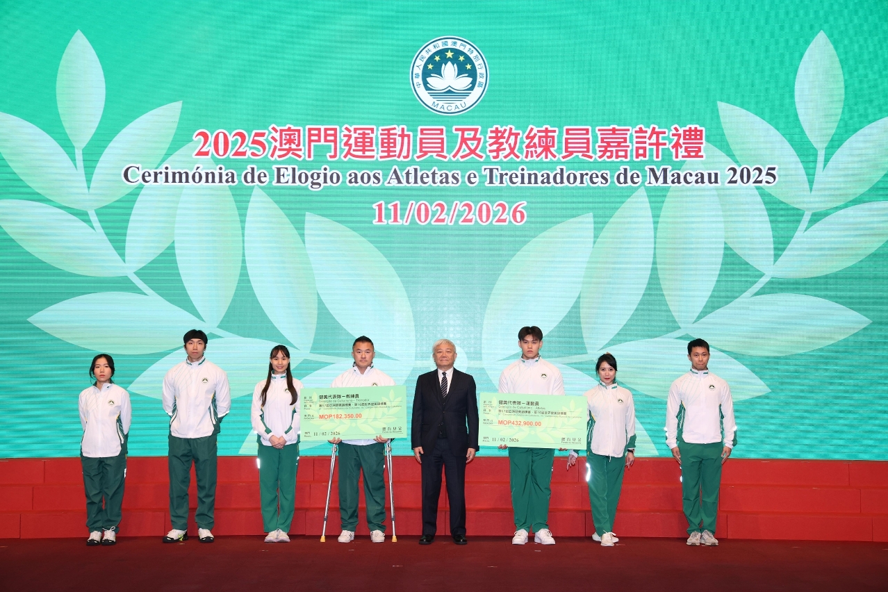 Para elogiar os atletas, treinadores e pessoal de apoio técnico de Macau que alcançaram resultados notáveis em competições desportivas de 2025, e para incentivar a Delegação Desportiva de Macau a destacar-se em grandes eventos desportivos do corrente ano, realizou-se ontem (dia 11), às 19H30, a Cerimónia de Elogio aos Atletas e Treinadores de Macau 2025 e de Compromisso de Honra da Delegação Desportiva 2026, com a presença da Secretária para os Assuntos Sociais e Cultura, O Lam, e de outros convidados para encorajar e felicitar os atletas.