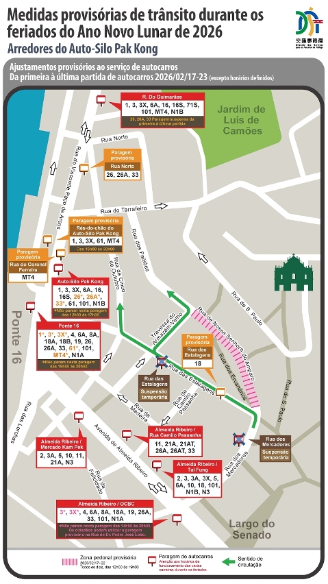 A DSAT já divulgou as informações sobre as medidas provisórias de trânsito para o período do Ano Novo Lunar. A data de implementação, os troços afectados e os pormenores dos ajustes aos serviços de autocarros podem ser consultados na página electrónica oficial (https://www.dsat.gov.mo/dsat/subpage.aspx?a_id=1770345744). Seguem-se as principais disposições temporárias: