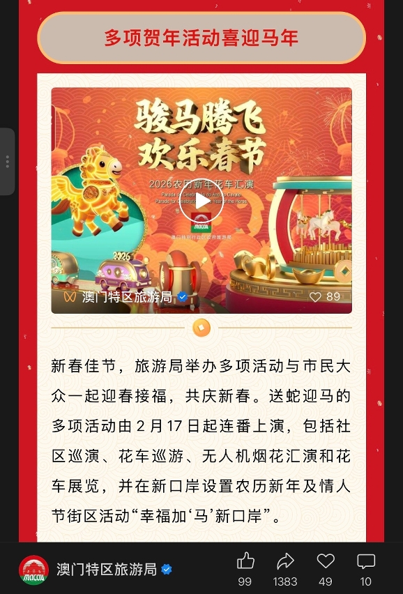 A DST organizará três eventos de grande envergadura para o Ano Novo Chinês, integradas no quadro de actividades “Feliz Ano Novo Chinês” do Ministério da Cultura e Turismo da República Popular da China, incluindo as “Actividades do Ano Novo Chinês 2026”, “Parada de Celebração do Ano do Cavalo” e “2026 Espectáculos de Drones e Fogo-de-Artifício”, que celebrarão as festividades, em conjunto com os residentes e visitantes, e exibirão a atracção do “turismo + eventos” de Macau.