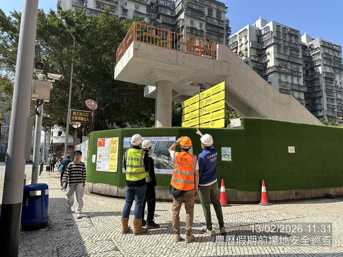 Com vista a garantir a segurança das obras públicas em curso durante o período do Ano Novo Chinês, a Direcção dos Serviços de Obras Públicas (DSOP) tem reforçado, nos últimos dias, a inspecção dos estaleiros sob a sua gestão, de modo a eliminar eventuais riscos de segurança, tendo exigido igualmente que, durante o período do Ano Novo Chinês, nos estaleiros sejam executados, rigorosamente, os planos de segurança, por forma a garantir que a população possa celebrar as festividades em segurança.