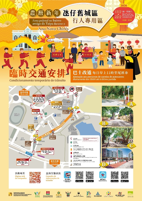 Para aumentar a atmosfera festiva durante o Ano Novo Lunar e criar um ambiente confortável e seguro nos bairros comunitários, a Direcção dos Serviços de Economia e Desenvolvimento Tecnológico (DSEDT), o Instituto para os Assuntos Municipais (IAM), a Direcção dos Serviços de Turismo (DST), o Corpo de Polícia de Segurança Pública (CPSP), o Corpo de Bombeiros (CB), o Instituto Cultural (IC) e a Direcção dos Serviços para os Assuntos de Tráfego (DSAT), vão instalar, em conjunto com a União Geral das Associações dos Moradores de Macau, a Federação Industrial e Comercial das Ilhas de Macau e a Federação da Indústria e Comércio de Macau Centro e Sul Distritos, as “zonas pedonais durante o Ano Novo Chinês”, a partir de amanhã (dia 17) até ao dia 22 de Fevereiro (do 1.º ao 6.º dia do primeiro mês do calendário lunar), diariamente das 12h00 às 19h00, no bairro antigo da Taipa e na Rua de Nossa Senhora do Amparo, respectivamente.