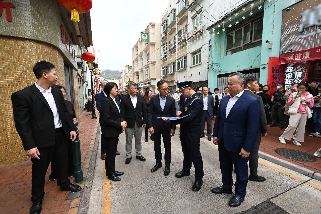 Durante os feriados determinados, a par da instalação permanente de zonas pedonais no bairro antigo da Taipa e na Rua de Nossa Senhora do Amparo, pelo Governo da RAEM, as autoridades de segurança implementaram os pertinentes planos policiais. Para inspecção in loco, o Secretário Chan e a sua delegação deslocaram-se, hoje, ao bairro antigo da Taipa para se inteirarem da situação do fluxo de pessoas na zona pedonal, das medidas de controlo do trânsito nas zonas periféricas e dos respectivos planos policiais, dando instruções à equipa do pessoal de segurança para garantir a ordem pública e o trabalho da triagem do fluxo de pessoas.