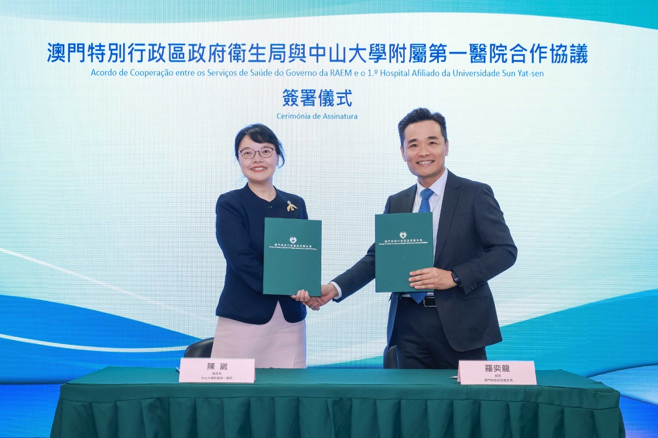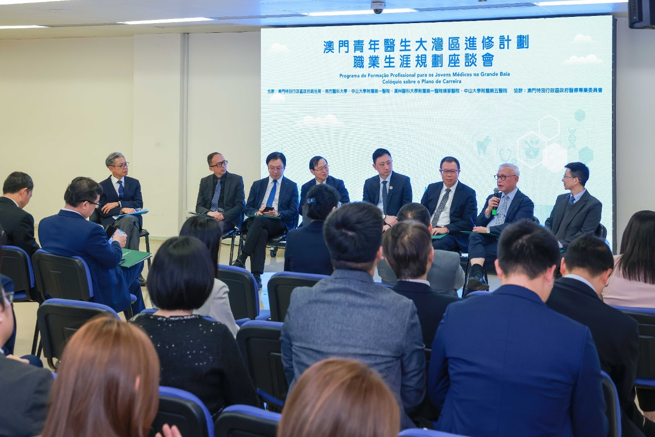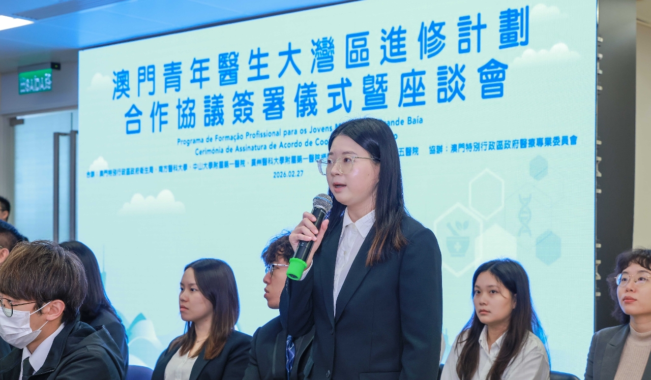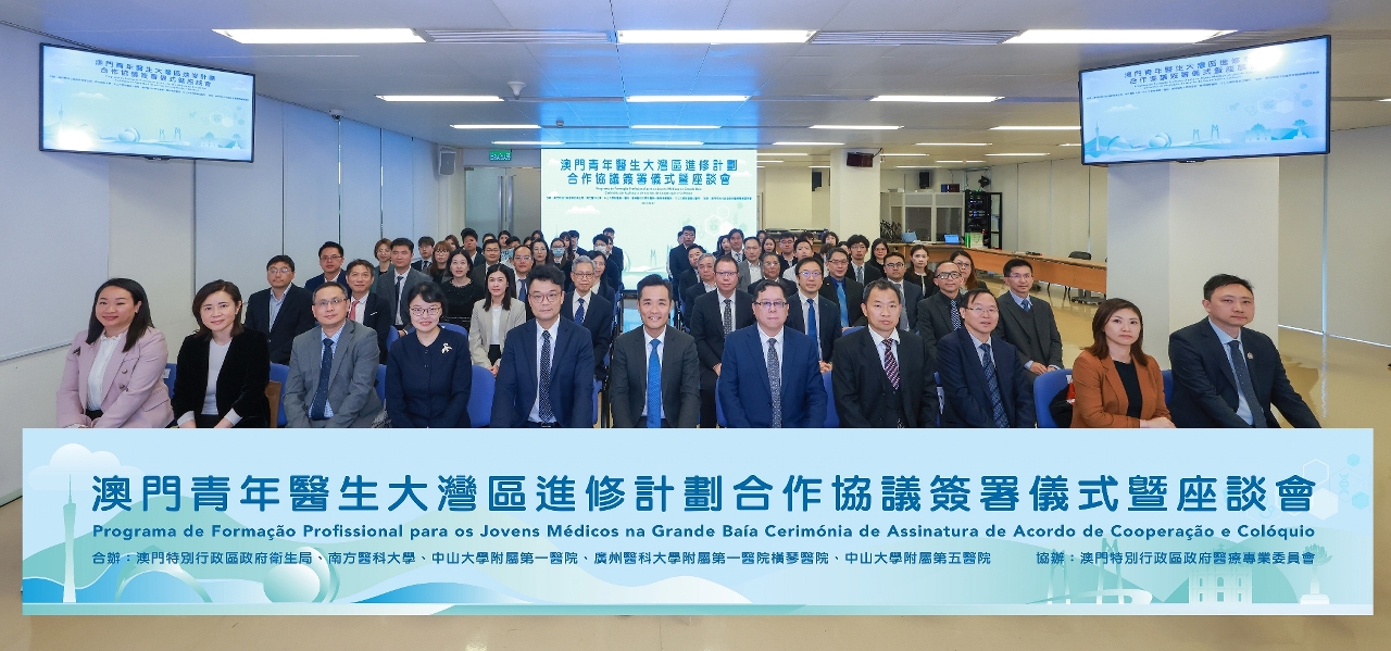 Com o objectivo de implementar as Linhas de Acção Governativa do Governo da Região Administrativa Especial de Macau (RAEM), reforçar as competências técnicas e a competitividade profissional dos jovens médicos locais, alargar as suas oportunidades de desenvolvimento e apoiar a sua melhor integração na conjuntura do desenvolvimento nacional — impulsionando, em simultâneo, o progresso tecnológico dos cuidados de saúde e a concretização da visão governativa de construir uma “Macau Feliz” — os Serviços de Saúde coorganizaram, com quatro hospitais da Grande Baía, nomeadamente o Primeiro Hospital Afiliado da Universidade Sun Yat‑sen, o Quinto Hospital Afiliado da Universidade Sun Yat‑sen, o Hospital Nanfang da Universidade Médica do Sul (Nanfang Hospital, Southern Medical University) e a Filial de Hengqin do Hospital Afiliado n.º 1 da Universidade de Medicina de Guangzhou, o “Programa de Formação Profissional para os Jovens Médicos na Grande Baía”, com a colaboração do Conselho dos Profissionais de Saúde (CPS), tendo sido realizada recentemente a cerimónia de assinatura de Acordo de Cooperação e Colóquio.