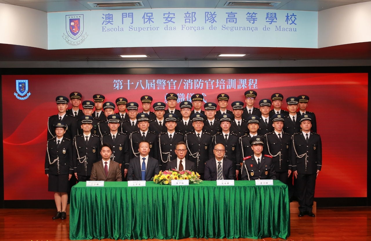 Na manhã de 11 de Março, a Escola Superior das Forças de Segurança de Macau, doravante designada por ESFSM, realizou a Cerimónia de encerramento do 8.º Curso de Comando e Direcção, a Cerimónia de encerramento do 18.º Curso de Formação de Oficiais destinado ao CPSP e ao CB e a Cerimónia de tomada de Posse dos Subcomissários e Chefes assistentes. As cerimónias foram presididas pelo Secretário para a Segurança, Chan Tsz King, e contou com a presença de convidados que são: o Director dos Serviços de Ligação para os Assuntos Policiais do Gabinete de Ligação do Governo Central na Região Administrativa Especial de Macau, Wang Qianjin, o Comandante-geral dos Serviços de Polícia Unitários, Leong Man Cheong, o Director-geral dos Serviços de Alfândega, Adriano Marques Ho, o Subchefe do Estado-Maior da Guarnição do Exército de Libertação do Povo Chinês em Macau, Liu Huan, o Reitor da Universidade de Macau, Song Yonghua, o subdirector da Direcção dos Serviços de Educação e de Desenvolvimento da Juventude, Teng Sio Hong, bem como os dirigentes dos serviços sob a tutela da Secretaria para a Segurança, para testemunharem juntos este momento de glória dos finalistas.
