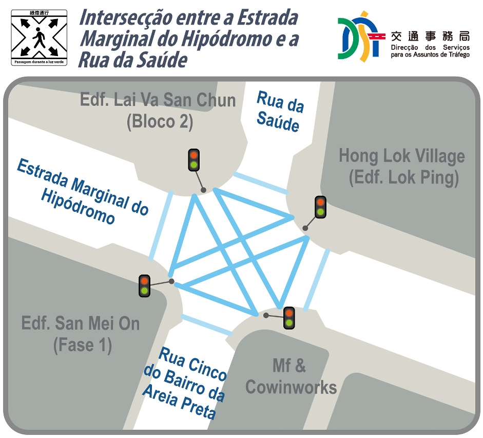 Com o objectivo de reforçar a segurança dos peões, reduzir a necessidade de atravessar a estrada duas vezes e encurtar o tempo necessário, e tendo em conta o fluxo intenso de pessoas e veículos no bairro de Iao Hon, a Direcção dos Serviços para os Assuntos de Tráfego (DSAT) tem instalado progressivamente travessias pedonais omnidireccionais nesta zona. Na sequência da instalação de travessias pedonais omnidireccionais em duas intersecções na Avenida da Longevidade, no início de Março, e após análise da eficácia e avaliação das condições rodoviárias, serão implementadas, a partir da manhã de hoje (dia 21), estas instalações nas intersecções semafóricas entre a Estrada Marginal do Hipódromo e a Rua da Saúde, junto do Hong Lok Village, e entre a Rua da Tribuna e a Estrada dos Cavaleiros, perto do Edifício Pak Lai.