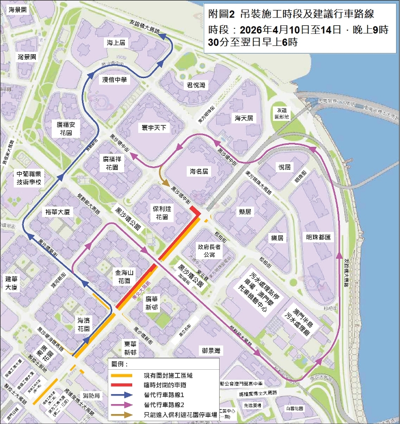 A empreitada de construção da travessia pedonal ao longo da Avenida do Nordeste, desde o seu início, tem decorrido dentro da normalidade, estando concluídos alguns pilares, ao que seguirão os trabalhos de elevação e montagem das estruturas de aço da travessia pedonal. De acordo com o plano de execução, os trabalhos de elevação e montagem estão divididos em quatro fases, avançando da Residência para Idosos em direcção à Avenida de Venceslau de Morais, com conclusão prevista para o final de Outubro. A primeira fase de elevação e montagem, no troço junto à Residência para Idosos, decorrerá durante o período nocturno entre 30 de Março e 18 de Maio de 2026. Atendendo à ocupação do espaço envolvente na realização de elevação e montagem em algumas partes, para garantir a segurança de circulação de veículos e de peões, após a coordenação interdepartamental, durante esse período, será encerrado o trânsito no troço da Avenida do Nordeste, entre a Rua Nova da Areia Preta e a Rua Central da Areia Preta e em outros troços relacionados (vide tabela 1). Adicionalmente, durante o encerramento do trânsito, os autocarros públicos e os demais veículos deverão contornar a outra via, e alterar-se-ão algumas carreiras de autocarros, nesse sentido, solicita-se aos cidadãos para planearem antecipadamente a deslocação e prestarem atenção às informações sobre os autocarros. Para mais detalhes sobre o ajustamento das carreiras de autocarros, queiram prestar atenção à tabela 2 e às informações divulgadas pelas duas companhias de autocarros (TCM: www.tcm.com.mo, TRANSMAC: www.transmac.com.mo).
