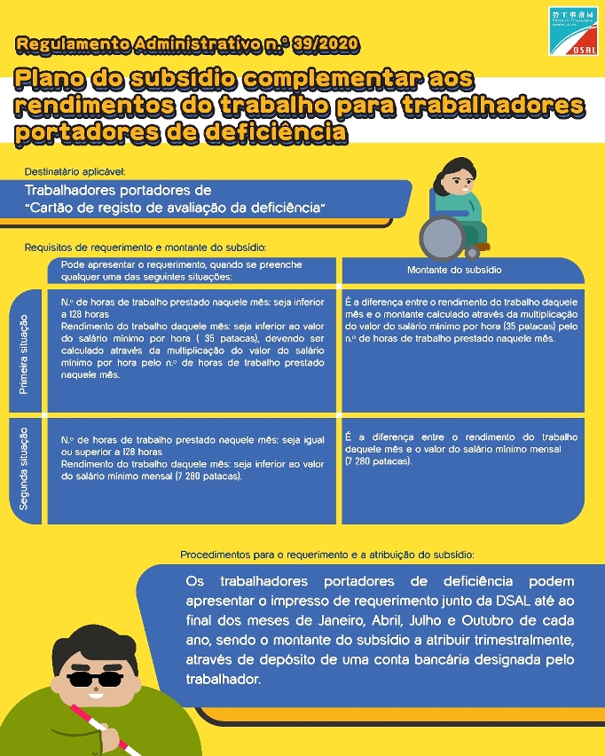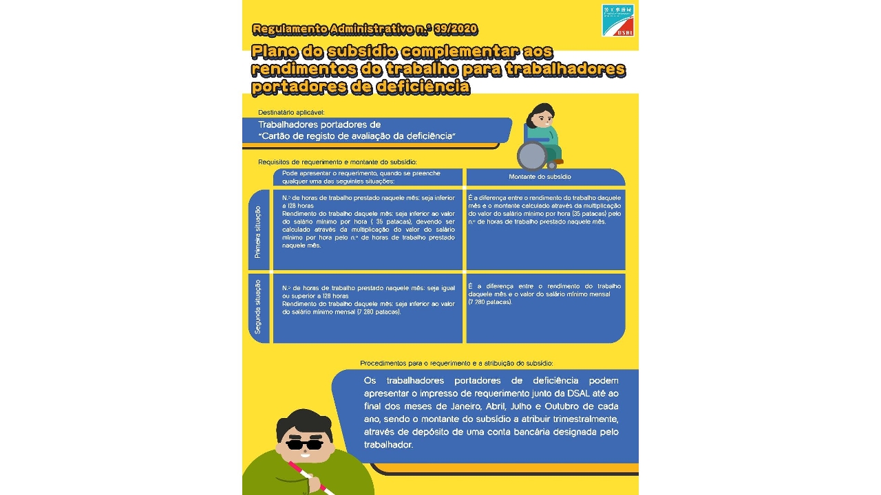 Com o objectivo de apoiar as pessoas portadoras de deficiência a integrarem-se no mercado de trabalho e de garantir o seu direito à percepção de um salário básico, o Governo da RAEM implementou, em 1 de Novembro de 2020, o Plano do subsídio complementar aos rendimentos do trabalho para trabalhadores portadores de deficiência (Plano), pelo que habilita, nos meses de Janeiro, Abril, Julho e Outubro de cada ano, os trabalhadores aptos a solicitarem o subsídio complementar referente ao trimestre anterior. O prazo para a apresentação de pedidos, referente ao 1.º trimestre de 2026, decorre entre 1 e 30 de Abril, pf. Os trabalhadores que reúnem os requisitos legais podem, durante o período em questão, dirigir-se à Direcção dos Serviços para osAssuntos Laborais (DSAL) para a entrega do respectivo pedido.