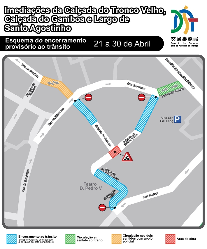 Em articulação com os trabalhos de reparação do pavimento do Instituto para os Assuntos Municipais (IAM) e com a execução conjunta da obra de assentamento de tubagem da empresa concessionária, serão implementadas por fases, a partir de 16 de Abril, medidas provisórias de trânsito nas imediações da Calçada do Tronco Velho, da Calçada do Gamboa e do Largo de Santo Agostinho, sendo que, entre os dias 21 e 30 de Abril, alguns troços serão temporariamente encerrados ao trânsito (vide tabela anexa). Durante o período das obras, serão igualmente implementadas medidas como circulação em sentido contrário, condicionamento de trânsito e circulação nos dois sentidos com apoio policial em alguns troços. Para mais informações, consulte a tabela anexa. Solicita-se a atenção dos condutores.