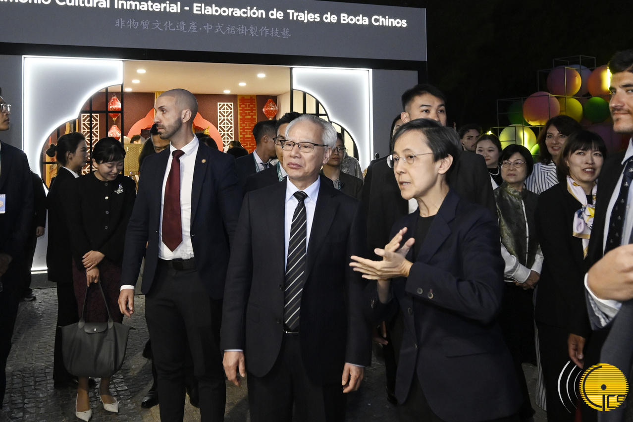 Chefe do Executivo, Sam Hou Fai, a secretária-geral da Organização Mundial do Turismo das Nações Unidas, Shaikha Al Nuwais, o embaixador da China em Espanha e Andorra, Yao Jing, e outros convidados, na“Noite de Macau", o último evento da grande actividade de promoção turística“Sentir Macau Roadshow em Madrid”.