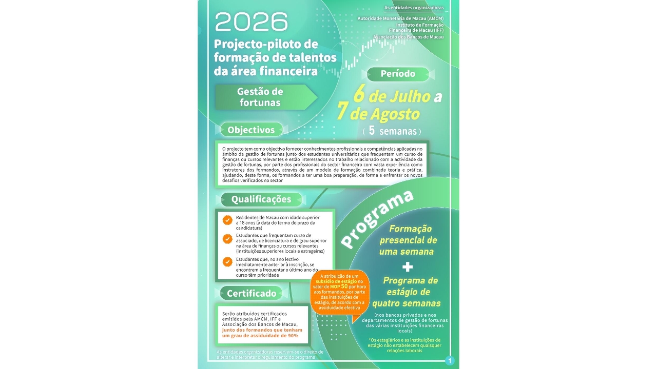 Com o objectivo de articular com a estratégia do Governo da RAEM para a diversificação adequada da economia, a Autoridade Monetária de Macau (AMCM), em conjunto com o Instituto de Formação Financeira de Macau e a Associação de Bancos de Macau, continua a organizar, no Verão de 2026, o “Projecto-piloto de formação de talentos da área financeira – gestão de fortunas” (adiante designado por “projecto-piloto”), com o objectivo de proporcionar formação profissional sistemática e experiência prática no sector financeiro a estudantes interessados em seguir uma carreira na área financeira, ajudando-os a melhorar as suas competências profissionais e reforçar a sua competitividade no mercado de trabalho. As inscrições para o Projecto-Piloto decorrem entre 16 de Março e 12 de Abril de 2026.