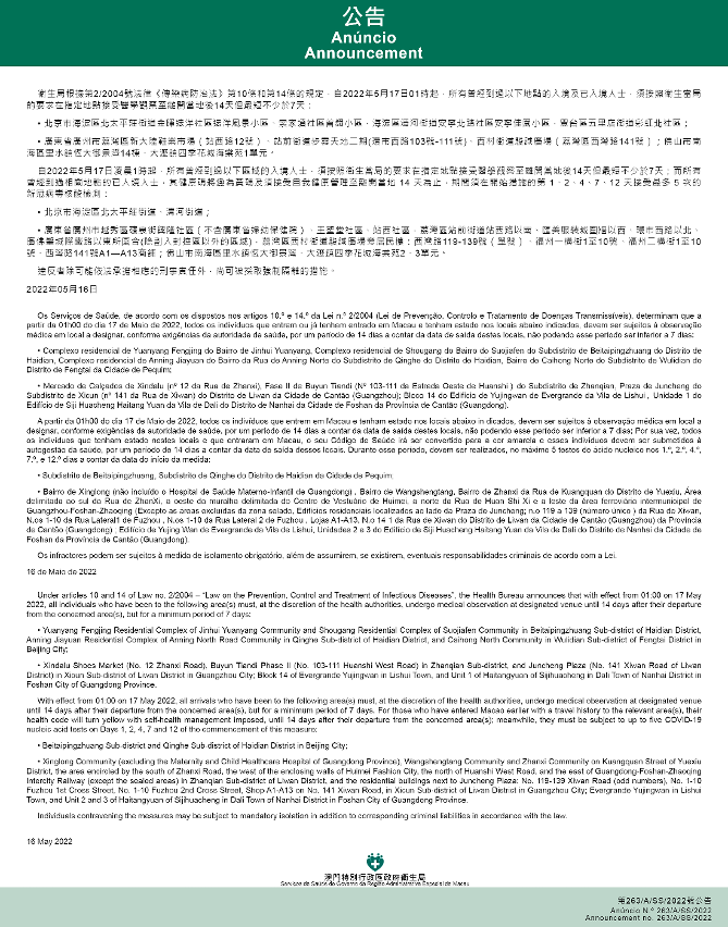 新型冠状病毒感染应变协调中心(下称应变协调中心)宣布,因应内地的疫情变化,卫生局根据第2/2004号法律《传染病防治法》第10条和第14条的规定,自2022年5月17日凌晨1时起,所有曾经到过以下地点的入境及已入境人士,须按照卫生当局的要求在指定地点接受医学观察至离开当地后14天但最短不少于7天: