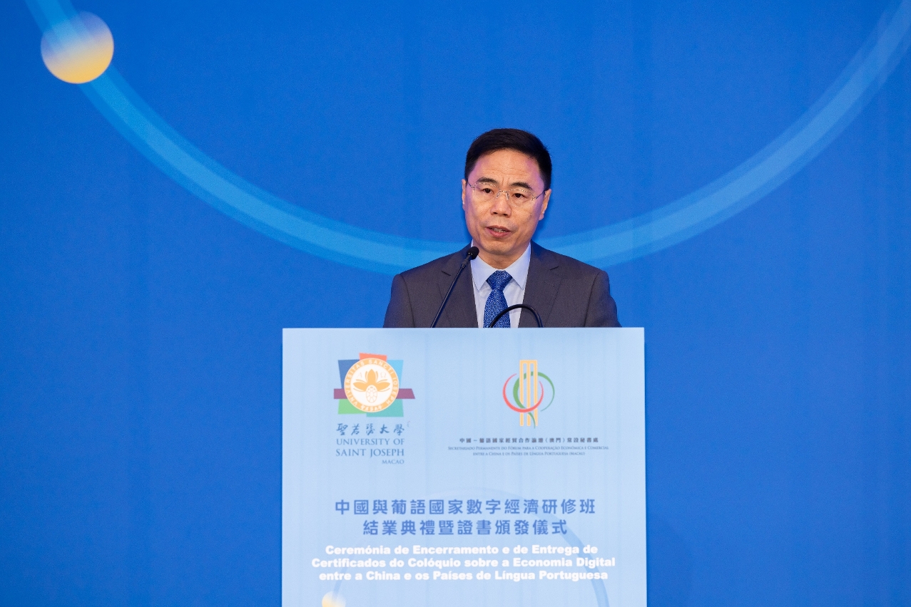 10月24日,由中国—葡语国家经贸合作论坛(澳门)常设秘书处主办的“中国—葡语国家数字经济研修班”在澳门银河国际会议中心举行结业礼。该研修班自10月13日至27日举办,有19名来自中国内地及九个葡语国家的相关领域官员、技术员和机构高管等代表参加。中葡论坛(澳门)常设秘书处秘书长季先峥、圣若瑟大学副校长Alexandre Lobo、研修班轮值班长Ensa Indjai等出席典礼并致辞。