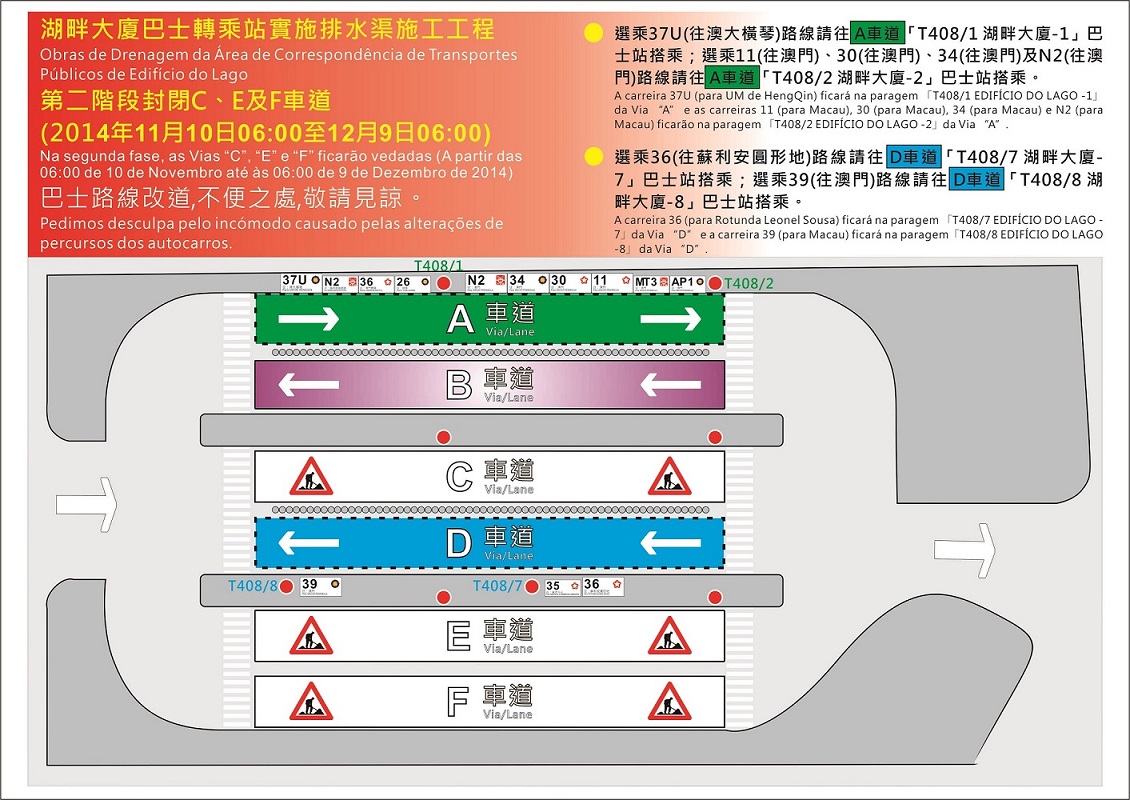 随着湖畔嘉模卫生中心排水渠工程推进,湖畔大厦巴士转乘站本月10日(周一)上午6时起临时封闭C、E及F车道,多条巴士路线需改停靠其他车道供乘客上落,工期约30日,交通事务局呼吁乘客留意。 湖畔嘉模卫生中心建造工程采取分阶段施工形式进行,以尽量减低居民使用湖畔大厦巴士转乘站出行的影响。首阶段工作已接近完成,接续第二阶段工程将於本月10日(周一)上午6时起开展,并临时封闭C、E及F车道,往澳门方向的11、30、34及N2,往澳门大学方向的37U路线改停靠A车道;39路线(往亚马喇方向)改停靠D车道;36路线(往苏利安圆形地)则使用D车道近出口方向之巴士站上落。 为方便乘客熟习上述路线停靠站点的调整,交通事务局将在湖畔大厦转乘站内设置指示牌,并安排保安管理公司人员及交通辅导员在场引导乘客乘车及维持秩序,同时会密切监察相关措施的施行情况,适时检讨、调整和优化。