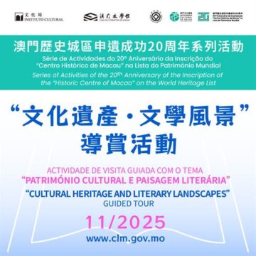 11月22日、23日、29日及30日(星期六及日),共四场,15:00-17:00为庆祝“澳门历史城区”申遗成功20周年,文化局辖下澳门文学馆将於11月举办4场“文化遗产‧文学风景”导赏活动,以文学为切入点,透过互动方式推广蕴藏在澳门文化遗产…