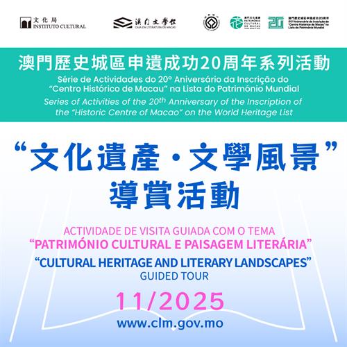 为庆祝“澳门历史城区”申遗成功20周年,文化局辖下澳门文学馆将於11月举办4场“文化遗产‧文学风景”导赏活动,以文学为切入点,透过互动方式推广蕴藏在澳门文化遗产景点中的文学价值,加深市民对澳门文化遗产的认知,增进文学知识。