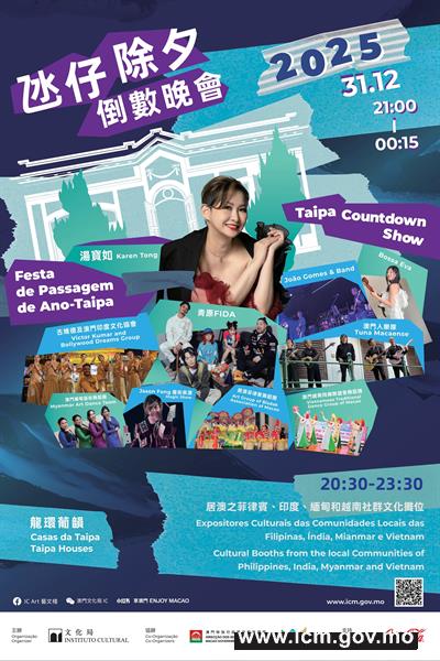 “2025氹仔除夕倒数晚会”将在龙环葡韵举行,晚会以多元文化共融为主轴,邀请香港歌手汤宝如担任压轴演出嘉宾,并献唱多首经典歌曲;本地音乐单位:青原、澳门人乐队、Bossa Eva与João Gomes & Band轮番献唱带动现场气氛;一系列文化特色演出展现城市多元魅力,包括古维德及澳门印度文化协会、居澳菲律宾舞蹈团、缅甸艺团、越南艺团将分别带来现代与传统歌舞表演,以及魔术师冯兆恒表演魔术。