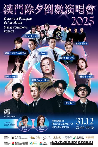 为与市民旅客共迎新年,“2025澳门除夕倒数演唱会”和“2025氹仔除夕倒数晚会”将於12月31日晚上,分别在澳门西湾湖广场和氹仔龙环葡韵举行。香港着名歌手陈蕾、乐队Dear Jane、汤宝如,以及多位本澳歌手、乐队将分别於澳门及氹仔倾力演出,营造浓厚的节日氛围。其中,“澳门除夕倒数演唱会”在倒数环节中将不会安排烟花表演,敬请市民及旅客留意。