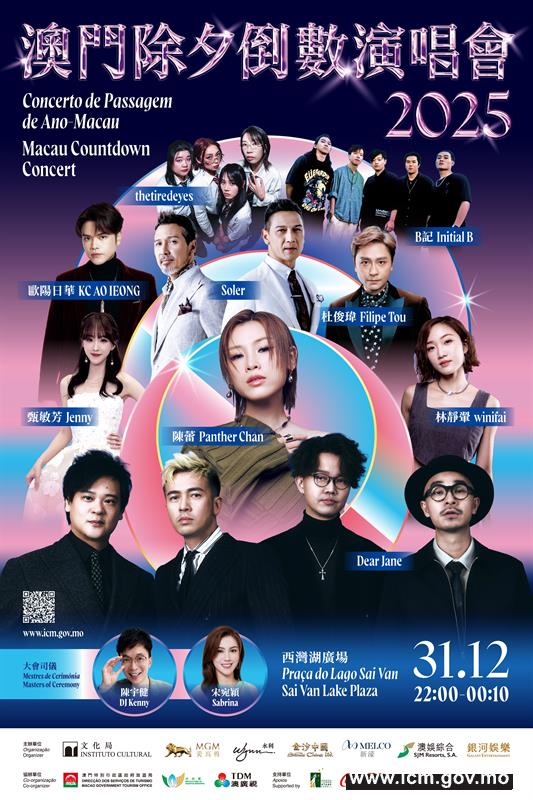 “2025澳门除夕倒数演唱会”将於12月31日晚上10时至翌日零时10分在西湾湖广场举行。演唱会压轴演出嘉宾邀请到香港实力唱将陈蕾与人气摇滚乐队Dear Jane登场,除了带来各自主打作品,更将同台合唱,以精彩演出带动全场热情气氛;本地演出阵容同样鼎盛,包括Soler、杜俊玮、欧阳日华、林静翬、甄敏芳、thetiredeyes 及B记轮番上阵,以多元音乐唱响璀璨除夕夜。演唱会舞台地面将采用电子屏幕结合灯光与视觉效果,打造全新的观演体验,整场演出以戏剧串连各演唱环节,透过剧情寄托对来年的祈愿,映照出城市中的动人面貌。