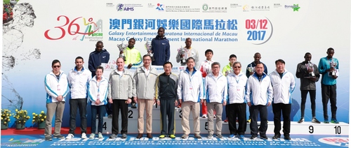 由体育局及澳门田径总会主办,银河娱乐集团冠名赞助的「2017澳门银河娱乐国际马拉松」今日(3日)於奥林匹克体育中心运动场举行,赛事共吸引超过50个国家及地区共12000名运动员角逐,由社会文化司司长谭俊荣等主持起步礼。其中特邀运动员肯尼亚的基利华与巴林的姬利娃,双双刷新大会纪录下包办男、女子组冠军,基利华在全场男子组以2小时10分01秒称王;而女子组冠军的成绩为2小时29分12秒。澳门运动员成绩方面,陈颂业与许朗分别赢得男、女子组的桂冠。