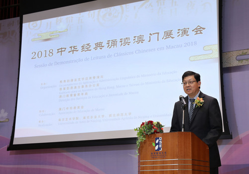 由国家教育部语言文字应用管理司与港澳台事务办公室及教育暨青年局主办,澳门中华教育会协办,南京艺术学院、南京农业大学及西北师范大学承办的“2018中华经典诵读澳门展演会”於4月17日下午3时假镜平学校(小学部)礼堂顺利举行。国家教育部语言文字应用管理司巡视员娄晶、教青局局长老柏生、中央人民政府驻澳门特别行政区联络办公室教育与青年工作部部长徐婷、教青局副局长梁慧琪及龚志明、澳门中华教育会会长何少金、澳门天主教学校联会会长周伯辉及理事长黄彪、澳门公职教育协会会员大会主席郑卫星,以及澳门各中小学学校负责人和约5百名师生出席了展演会。