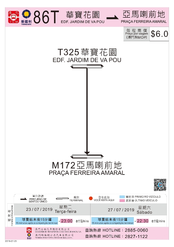 另外,临时增设两巴联营的“86T”接驳路线,由“华宝花园”站单程直达往亚马喇前地,中途不停靠其它站点;首班车于球赛结束约15分钟后发出,服务时间至晚上10时30分,班次约8分钟一班。