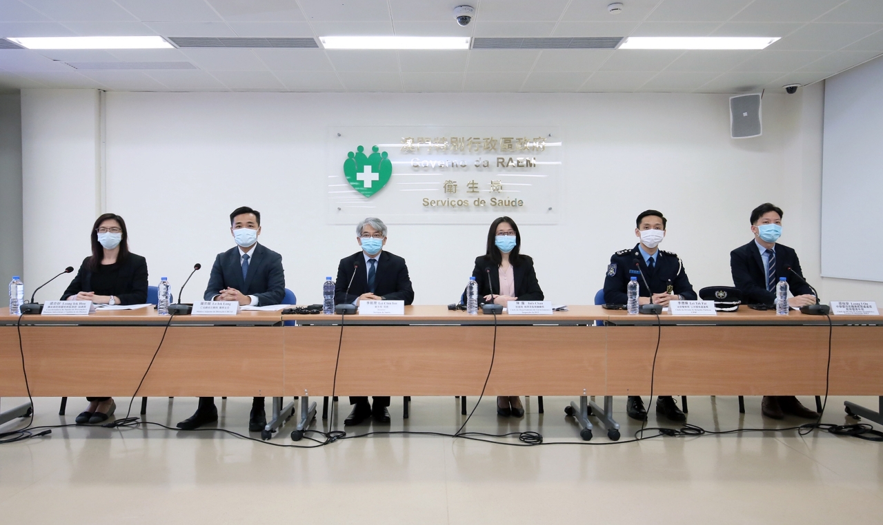 新型冠状病毒感染应变协调中心(下称应变协调中心)于今(29)日举行例行记者会,卫生局李展润局长、仁伯爵综合医院罗奕龙医务主任、旅游局执照及监察厅陈露厅长、教育暨青年局中学暨技术职业教育处梁怡安处长、治安警察局公共关系处李德辉处长、疾病预防控制中心传染病防制暨疾病监测部梁亦好协调员共同会见传媒。
