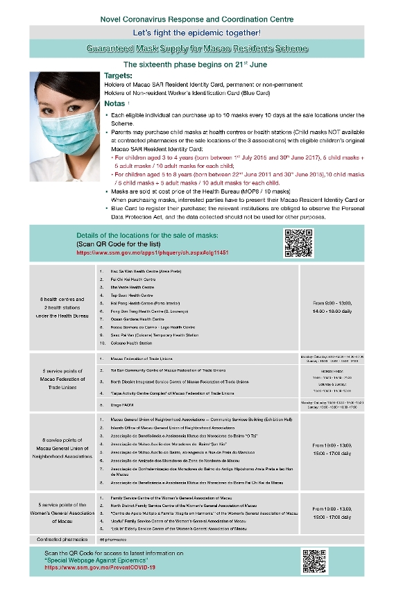 第十六轮计划的实施方式、售卖点及时间与第十五轮相同。而计划的对象为本澳永久及非永久居民、持外地雇员身份认别证(俗称蓝咭)人士;卫生局辖下卫生中心及卫生站、卫生局协议药房、本澳三个社团(工联、街总、妇联)继续提供售卖口罩服务,即全澳共有84个售卖点,详情见附图。