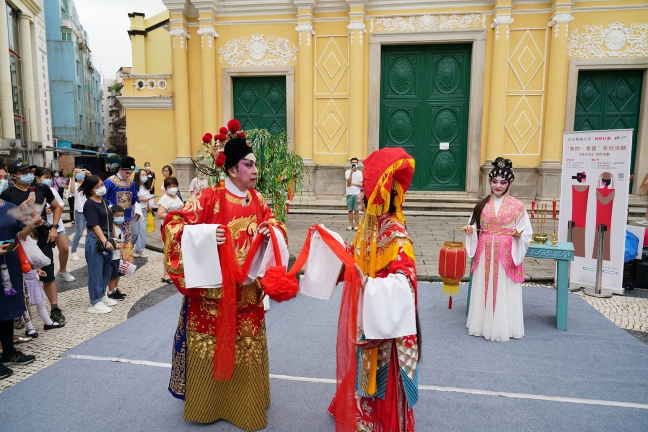 在推动非物质文化遗产的传承方面,粤剧在2009年被联合国教科文组织列入《人类非物质文化遗产代表名录》,市民在“粤闪‧粤赏”系列活动中藉粤剧经典《帝女花》讲座,认识其创作历程、人物形象、曲词文采、服装及布景特色,文化传播大使更化身粤剧名伶,周末在各社区呈现快闪粤剧表演,为社区带来独特的风景,有市民即席学习摆动服饰的水袖,摆出特定的造型架式,功架十足;“中西药局旧址X凉茶配制知多D”工作坊,让市民在中西药局亲身瞭解澳门非物质文化遗产“凉茶配制”的知识与技巧,在具有历史感的场所中感受非遗魅力。