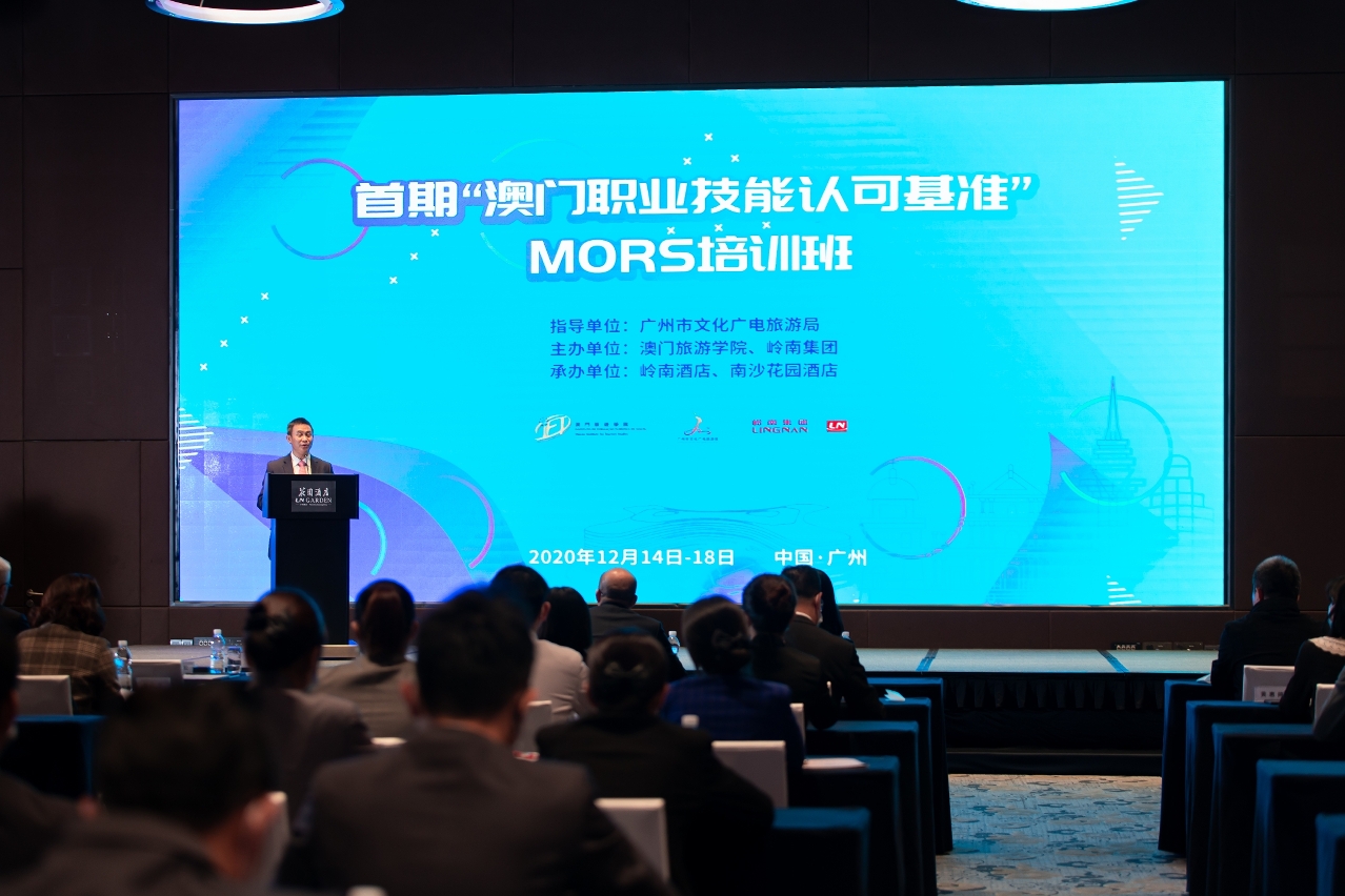 为全面把握粤港澳大湾区战略发展机遇,深入贯彻落实习近平总书记致首届全国职业技能大赛贺信精神,大力弘扬劳模精神、劳动精神、工匠精神,在全国政协副主席何厚铧、广州市委主要领导关心支持下,12月14日,广州市文化广电旅游局、澳门旅游学院、岭南集团联合将 “澳门职业技能认可基准MORS”培训及评核体系引入广州,并在南沙花园酒店举办广州地区首期澳门职业技能认可基准培训班开班仪式。本期MORS培训班是澳门、广州两地旅游行业校企合作、产业合作,实现多方面多层次战略合作的首个落地项目。