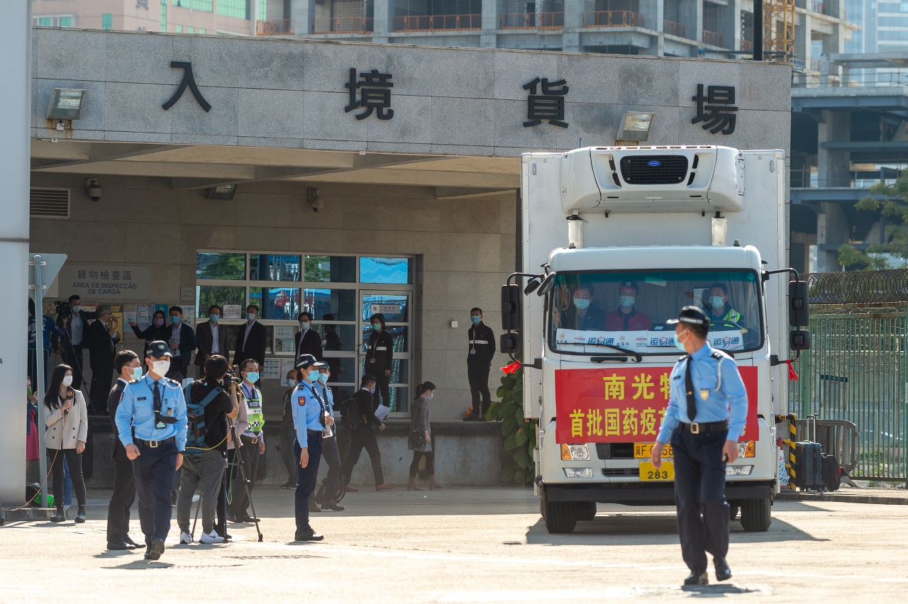 此批疫苗由北京以陆路经过30多小时运抵本澳,运输过程得到了中联办、南光(集团)有限公司及相关部门的全力协助。在卫生局药物事务厅稽查人员完成入口检查手续后,南光集团傅建国董事长移交国药集团新型冠状病毒灭活疫苗,由卫生局李展润局长签署接收疫苗文件。出席仪式的还有中联办宣传文化部万速成部长、殷汝涛副部长;卫生局陈永华副局长、药物事务厅蔡炳祥厅长、疾病预防控制中心林松主任等。
