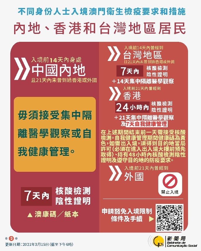 【图文包】2021/03/15最新入境澳门卫生检疫要求和措施
