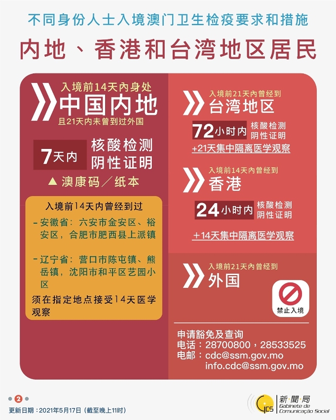 【图文包】2021/5/17最新入境澳门卫生检疫要求和措施