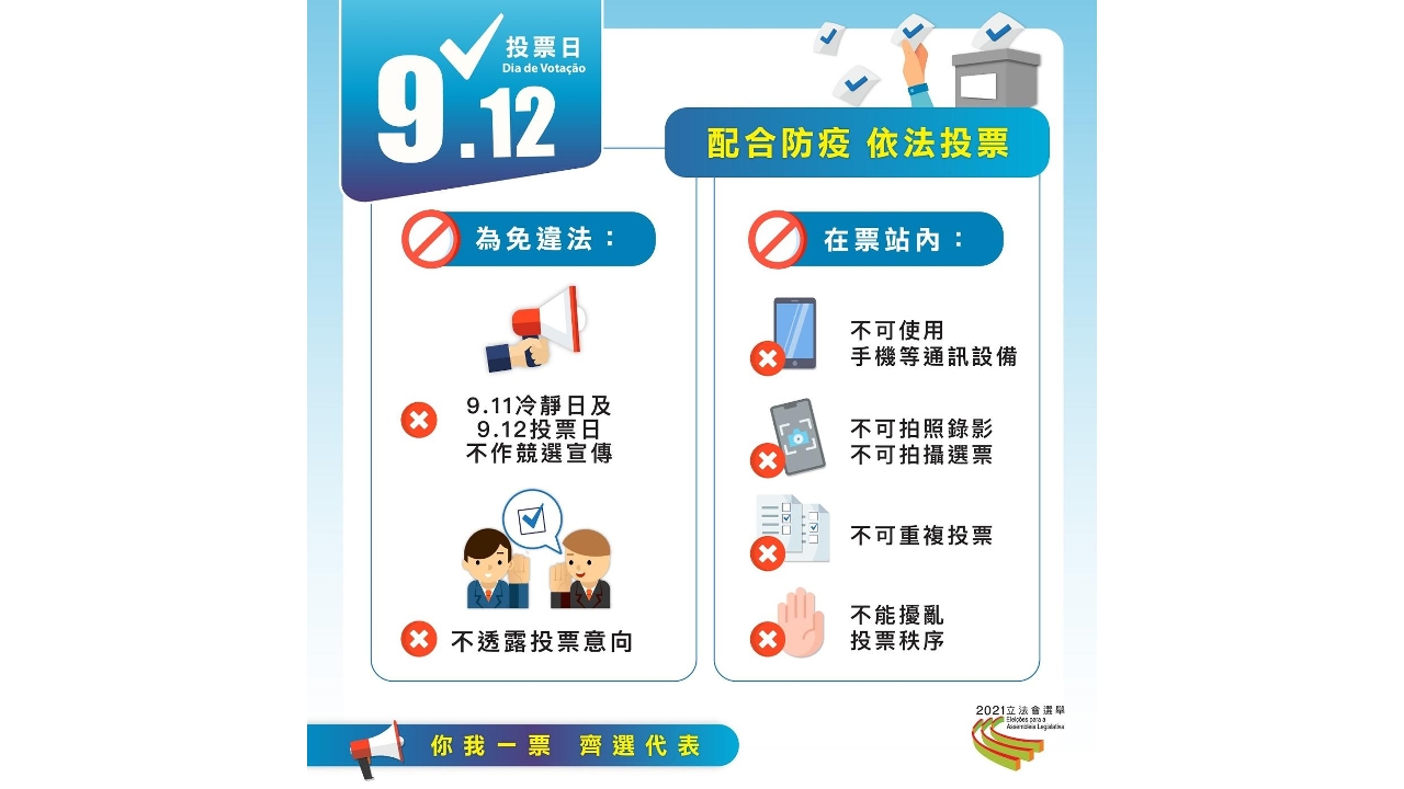 9月11日零时踏入立法会选举冷静期,任何人不可再进行竞选宣传。9月12日投票日,选民须带同永久性居民身份证到所属票站投票。