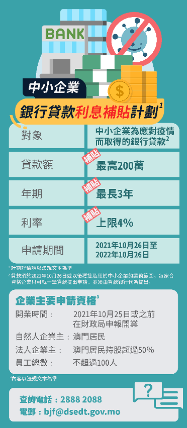 根据第5/2020号行政法规《中小企业银行贷款利息补贴计划》及第158/2021号行政长官批示,符合资格的澳门中小企业,如于2021年10月26日起计12个月内获得澳门银行批出一笔用于应对新冠疫情的贷款,可自明(26)日起透过银行申请利息补贴。贷款额上限为200万澳门元,补贴期最长为三年,年补贴率上限为四厘。申请期至2022年10月26日结束。