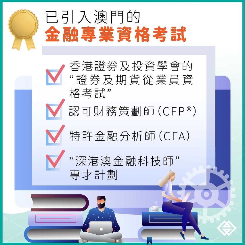为配合现代金融业的发展所需,金管局持续推动澳门金融学会与多个专业资格协会合作,引进国际和区域广泛认可的金融专业资格在澳门设立考点,方便居民考证,逐步建立本地金融人才队伍。金管局亦制作了“澳门金融人才培育”宣传片,鼓励居民考证,并透过澳门金融学会设置了 “金融人才培育资讯网”,便利居民获取考试资讯。