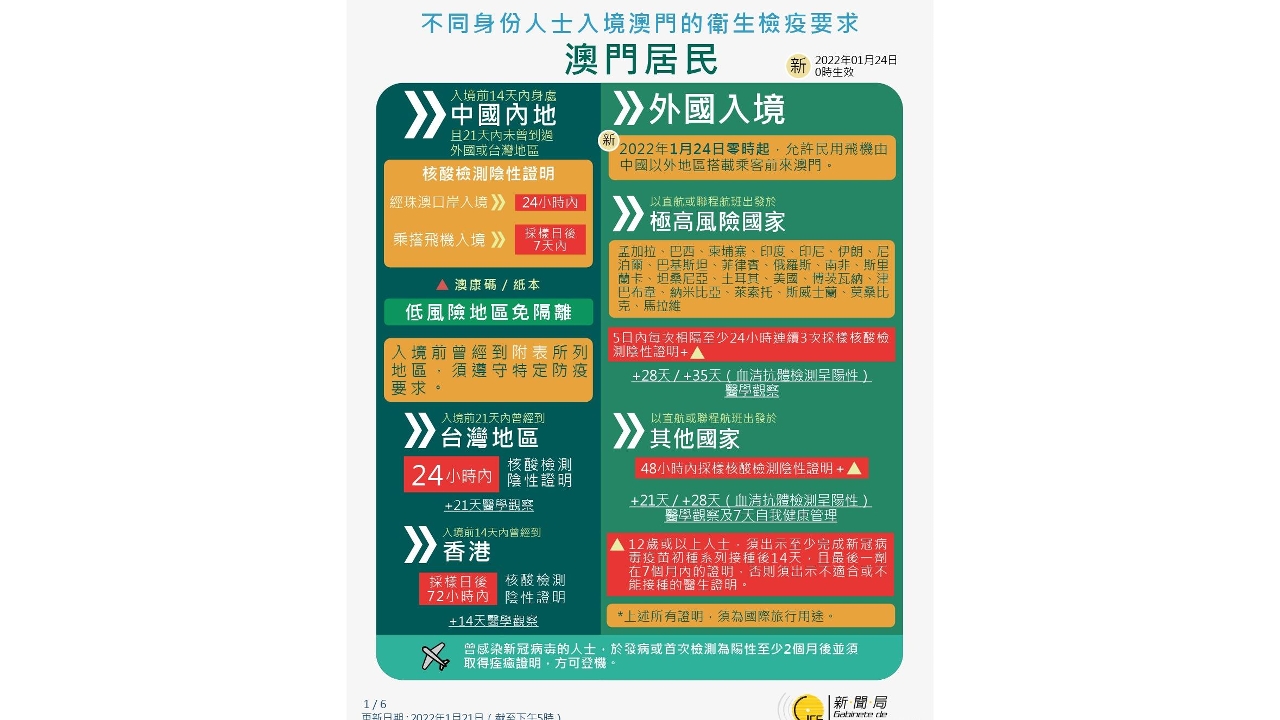 【图文包】2022/1/22最新入境澳门的卫生检疫要求