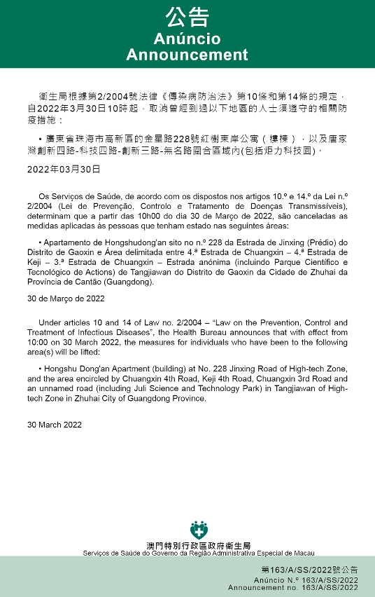 另,自2022年3月30日早上10时起,取消曾经到过以下地区的人士须遵守的相关防疫措施:广东省珠海市高新区的金星路228号红树东岸公寓(楼栋),以及唐家湾创新四路-科技四路-创新三路-无名路围合区域内(包括炬力科技园)。