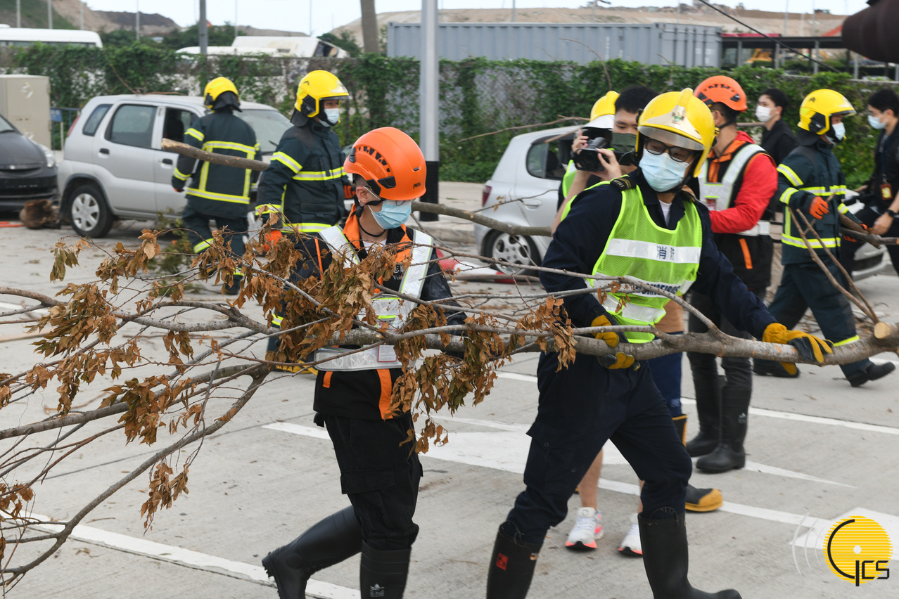 “水晶鱼2022”台风演习-消防局人员联同多名民防志愿者合力清除阻塞路面的倒塌树木及其他障碍物。