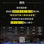 受天气影响,原定于2022年5月1日及2日举行的“翱游澳门无人机表演盛会”的四场演出将延后至5月3日晚上8时正及9时30分及4日晚上8时30分及9时45分举行。
